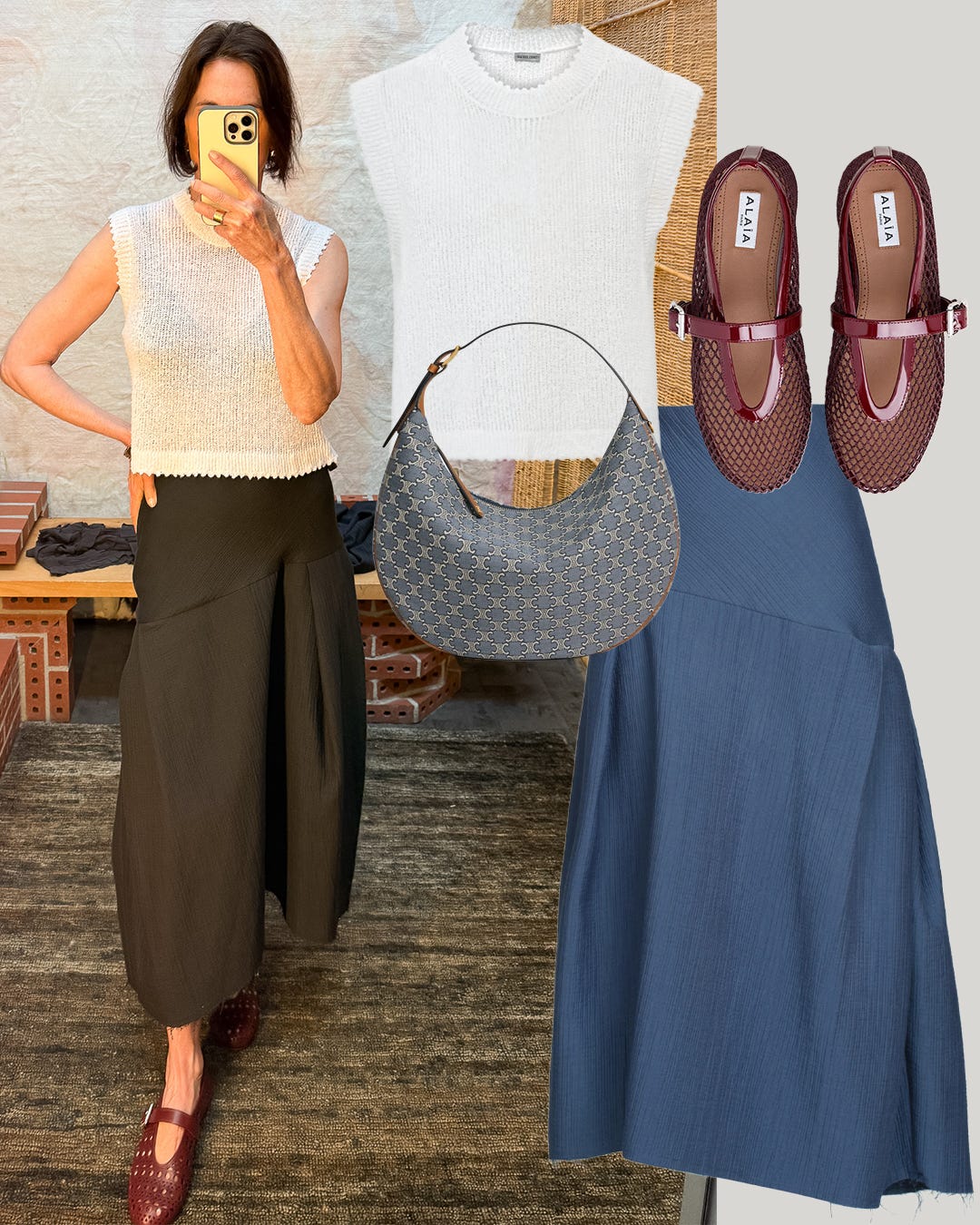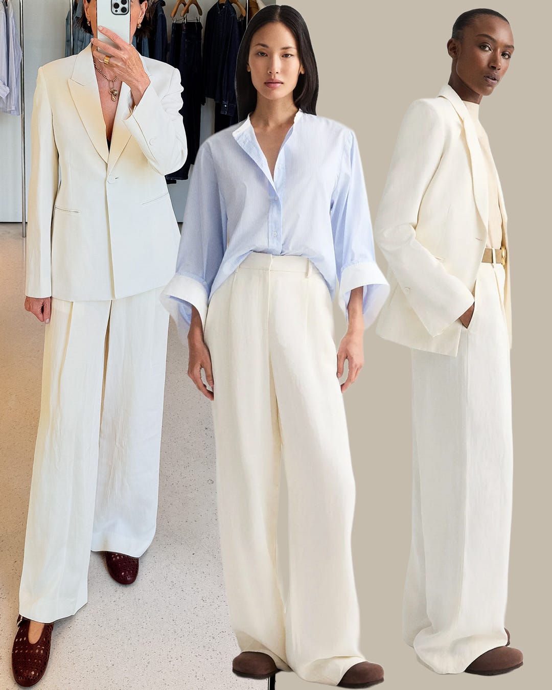 Texture was the next thing I focused on. A coated viscose-linen exclusive to TWP held my attention. The sateen-like finish provided an interesting contrast against flat cotton, linen, and denim. The sheen and drape don’t translate well in photos, but in person, the hand of the fabric was an easy sell and had me seriously considering a softly tailored ivory blazer and trousers. Both worked independently: the trousers with any top I tried on, the blazer going from polished as a suit to something unexpectedly cool with the vintage-wash jeans I was wearing. I thought about the blazer’s range, day into evening, and how elegant it would look over a slip dress at night.