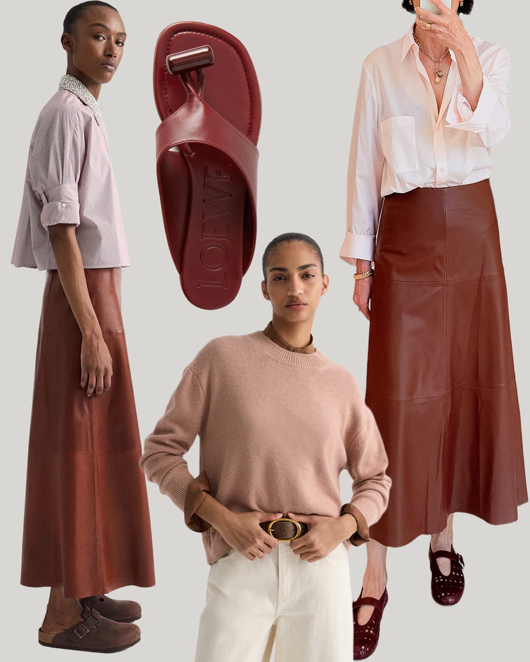 A pale pink superfine cotton shirt caught my eye too, a color I would normally dismiss. Trying it on with a cognac leather skirt changed my mind. I loved the combination. The leather skirt stood out as the singular piece I’d want in my closet. Thinking of the numerous other ways I’d wear it year-round moved it to the top of my spring wish list.