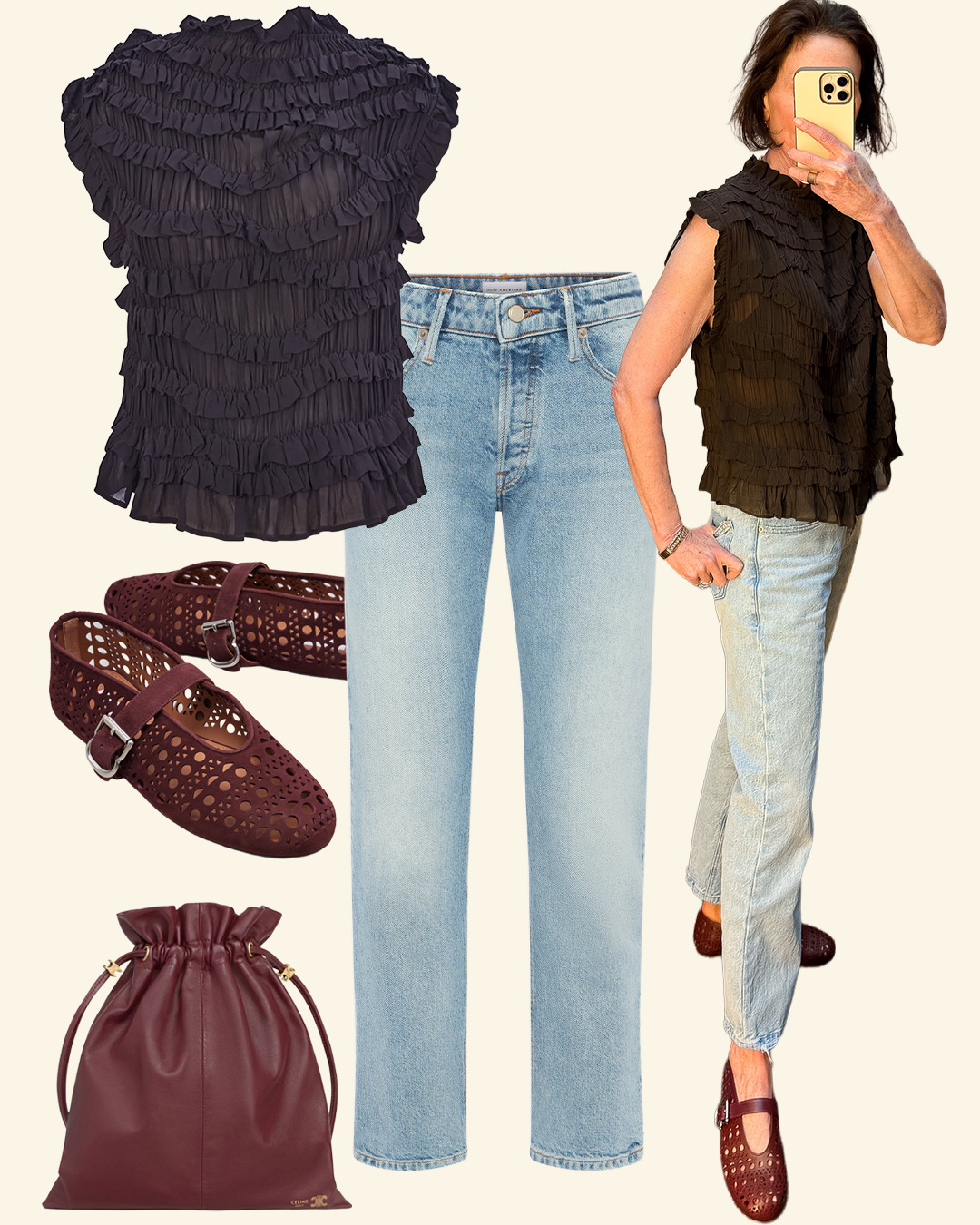 My attraction to texture carried through to tops. I tried on their best-selling open-weave sweater in both long sleeves and a tank. Either would look great paired back with the skirt or TWP pants. A ruffled georgette top offered another option. I liked the ease, loose fit, and how well the top worked with the jeans I was wearing. It’s the kind of piece that would define an otherwise simple outfit.