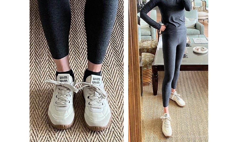 Speaking of Miu Miu…I almost kept these. The good…they’re different enough but not screaming look at me. The bad…the Miu Miu logo is a bit much. I’m also not sold on the nylon fabrication either, although that’s what makes them cool. They were returned. Wearing above with my workout uniform just to try on. They’re not athletic shoes by any means.