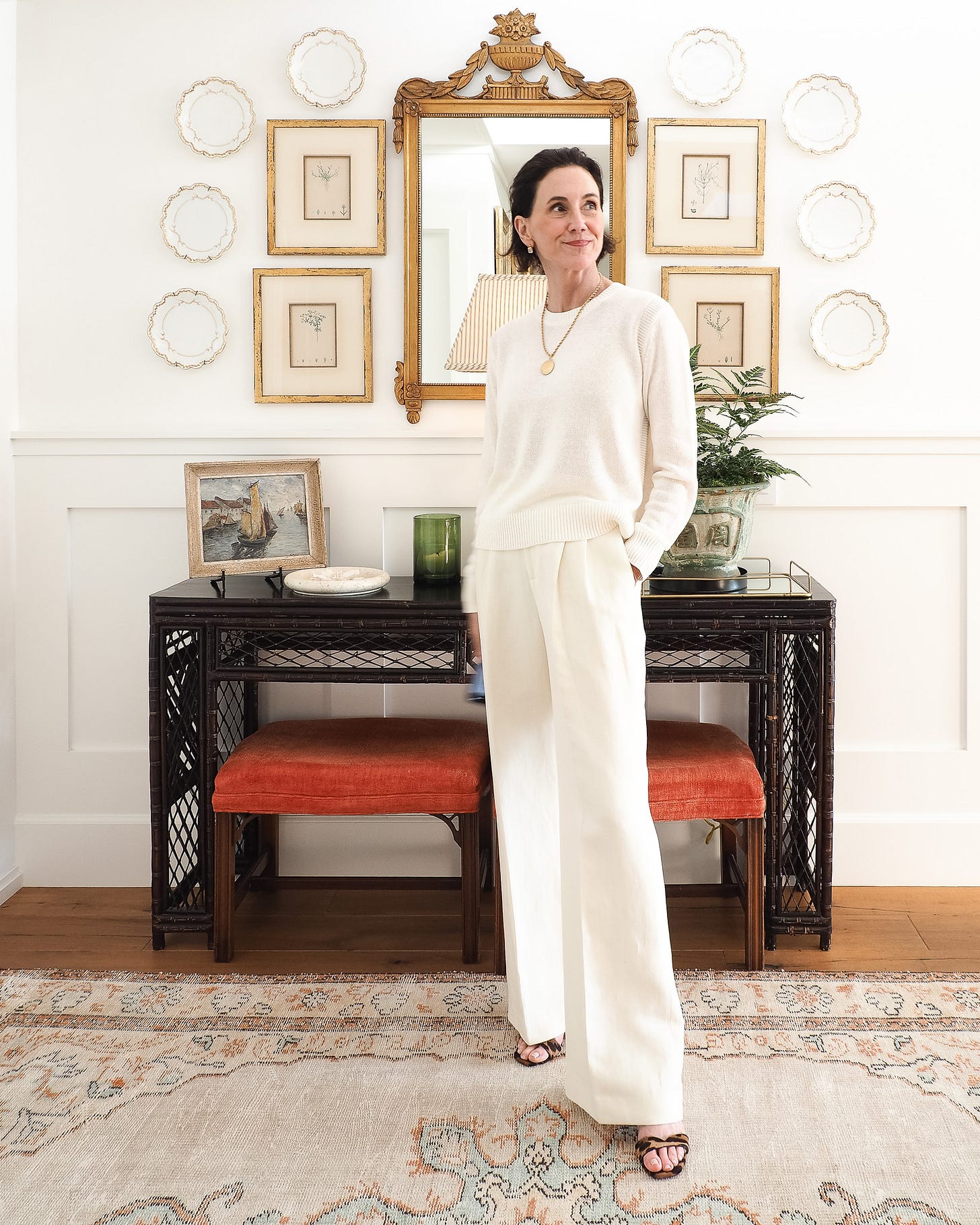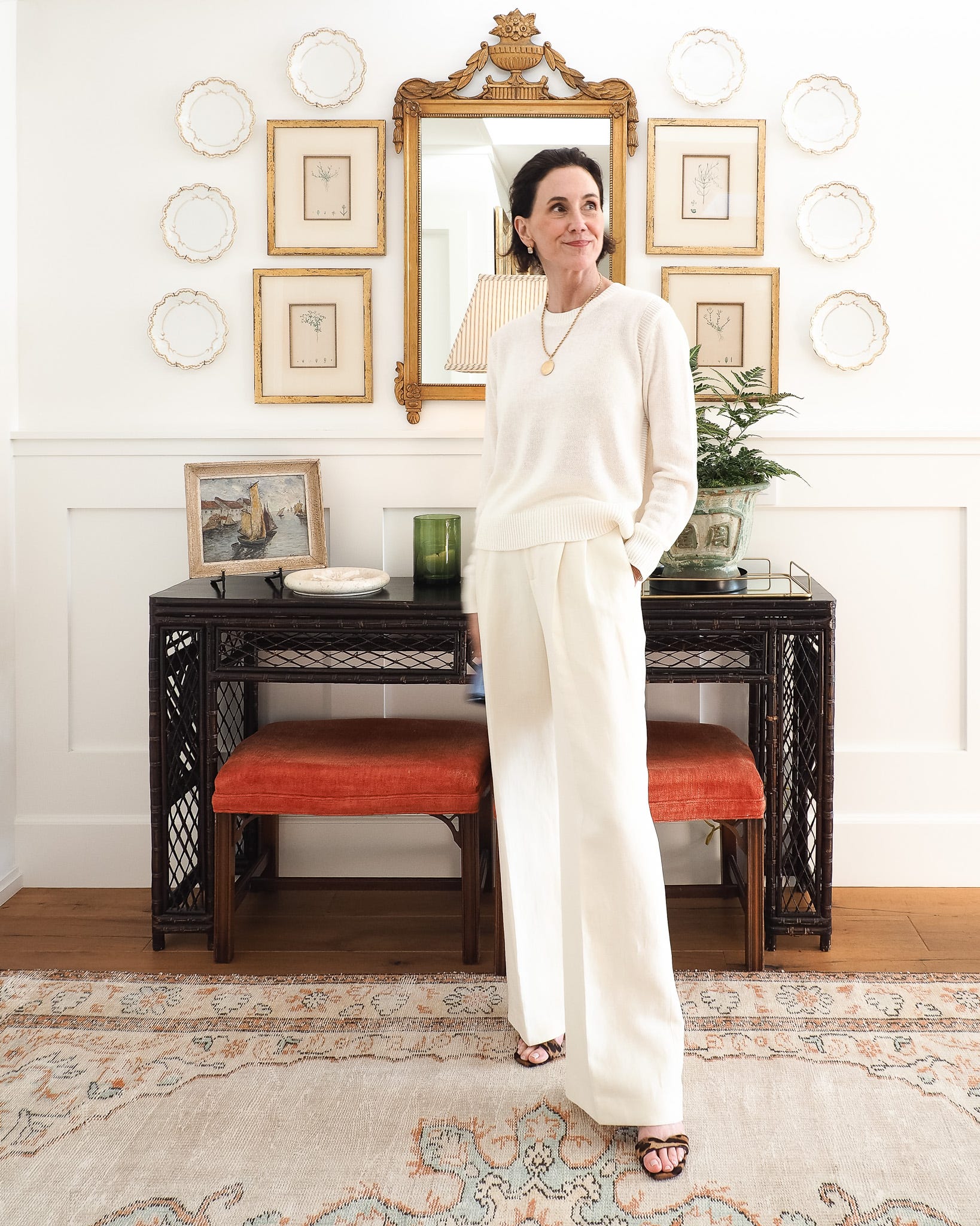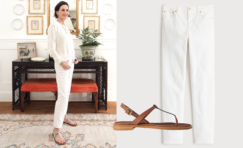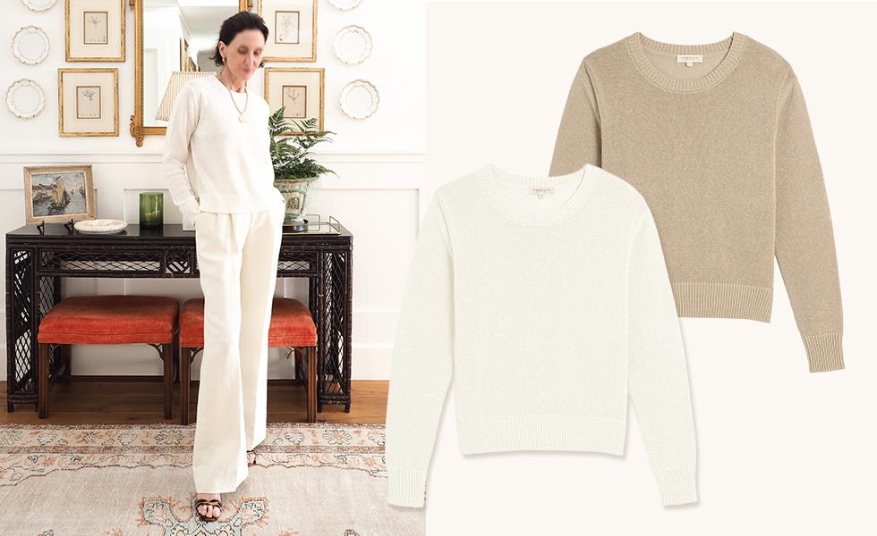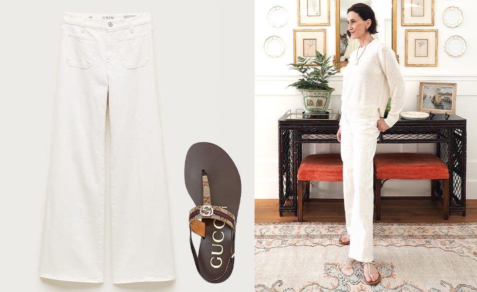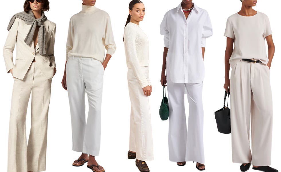 The first is a monochrome ivory look. A summer-weight cotton linen sweater with wide-leg trousers (old Nili Lotan) in the same pale tone. Sticking with one color removes the question of what goes with what and is a strong start for an easy stylish look.