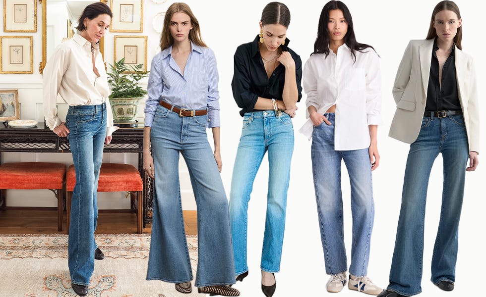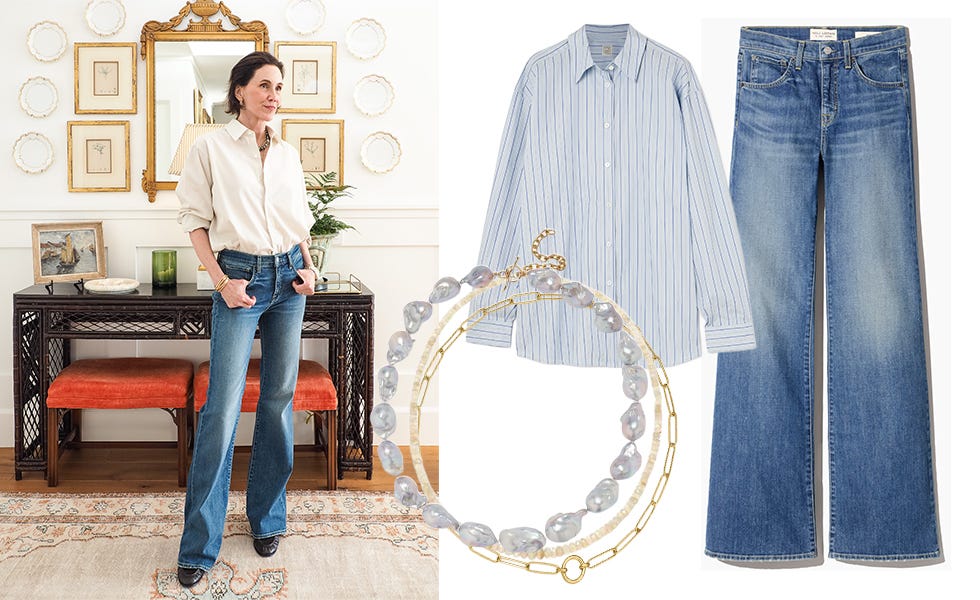 The second is a poplin shirt with jeans, which needs little explanation. Straightforward, but the details matter. I like the shirt oversized, unbuttoned, sleeves rolled, and tucked in. I want it to project a relaxed vibe and those small adjustments are what make the difference between looking effortless and overthought. I’m wearing the Celia jean from Nili Lotan - a brand I consistently rely on for fit, style and quality. The medium rise hugging the hips lands perfectly to contain the volume of the shirt, while the wide leg skims without clinging. A low heel helps create an elongated look. Adding a belt is optional.