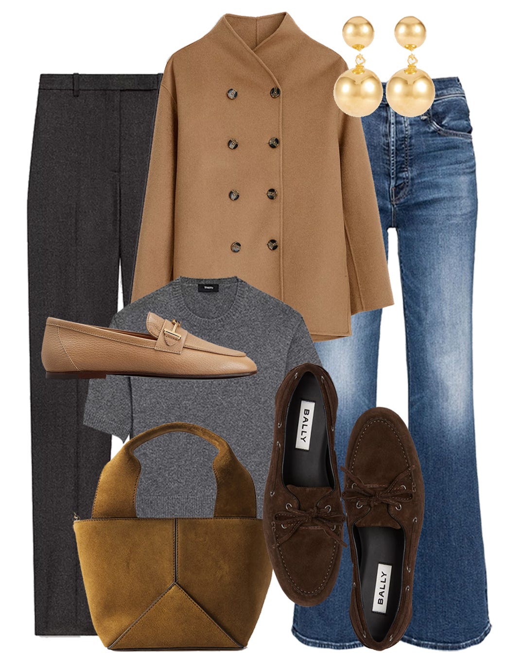 grey pants, camel jacket, (also here and here), jeans, earrings, suede boat shoes, tan loafers, suede bag, grey sw…
