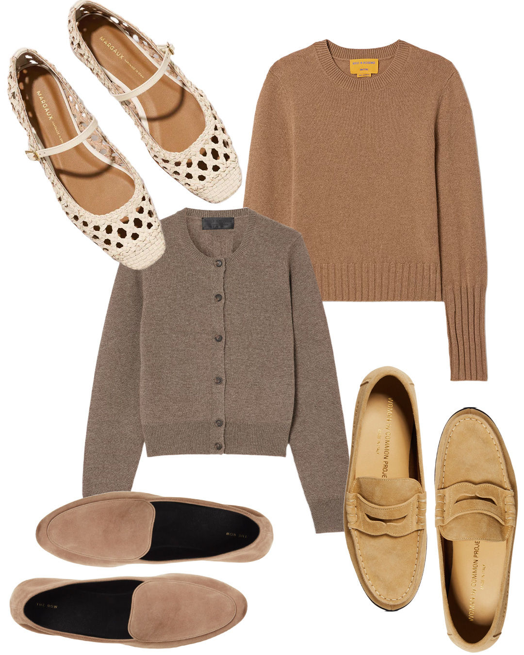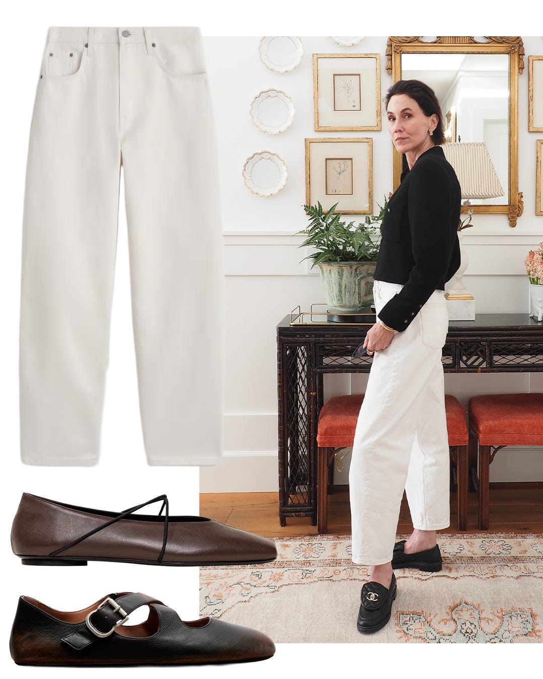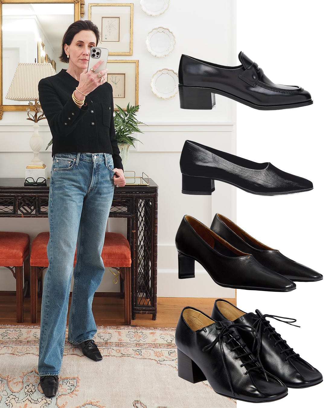If shopping for a similar style, the most important element is an elongated toe box to maintain the appearance of a longer leg. I love all of these low-heeled options that would create the same effect with any trouser or denim with a full bottom. My preference is a high vamp, so the Lemaire lace-ups and Khaite pumps are my two favorites.