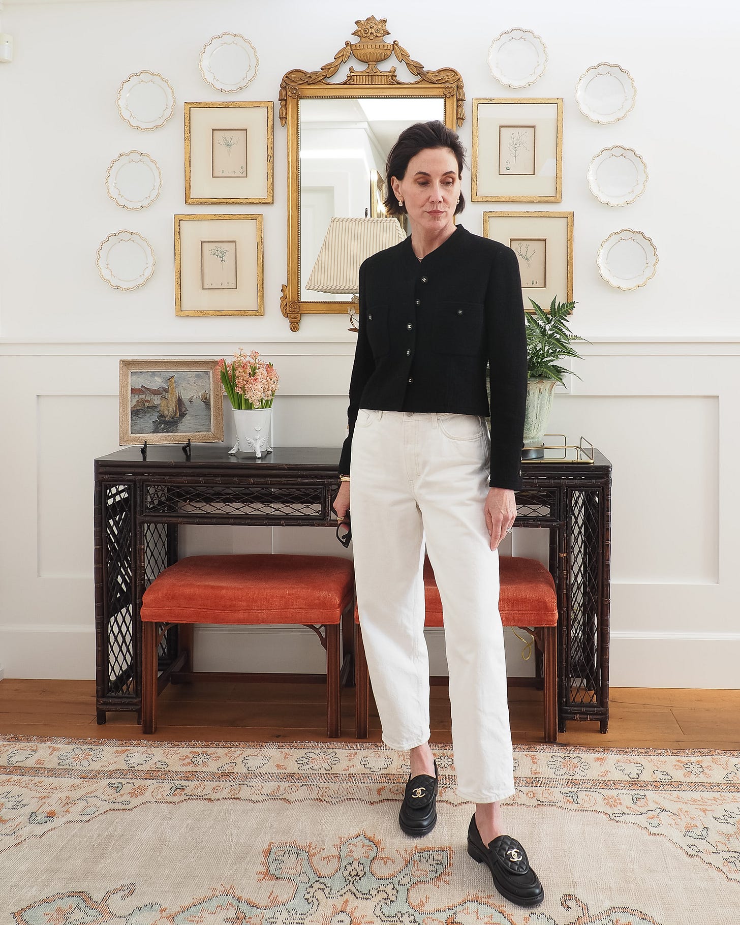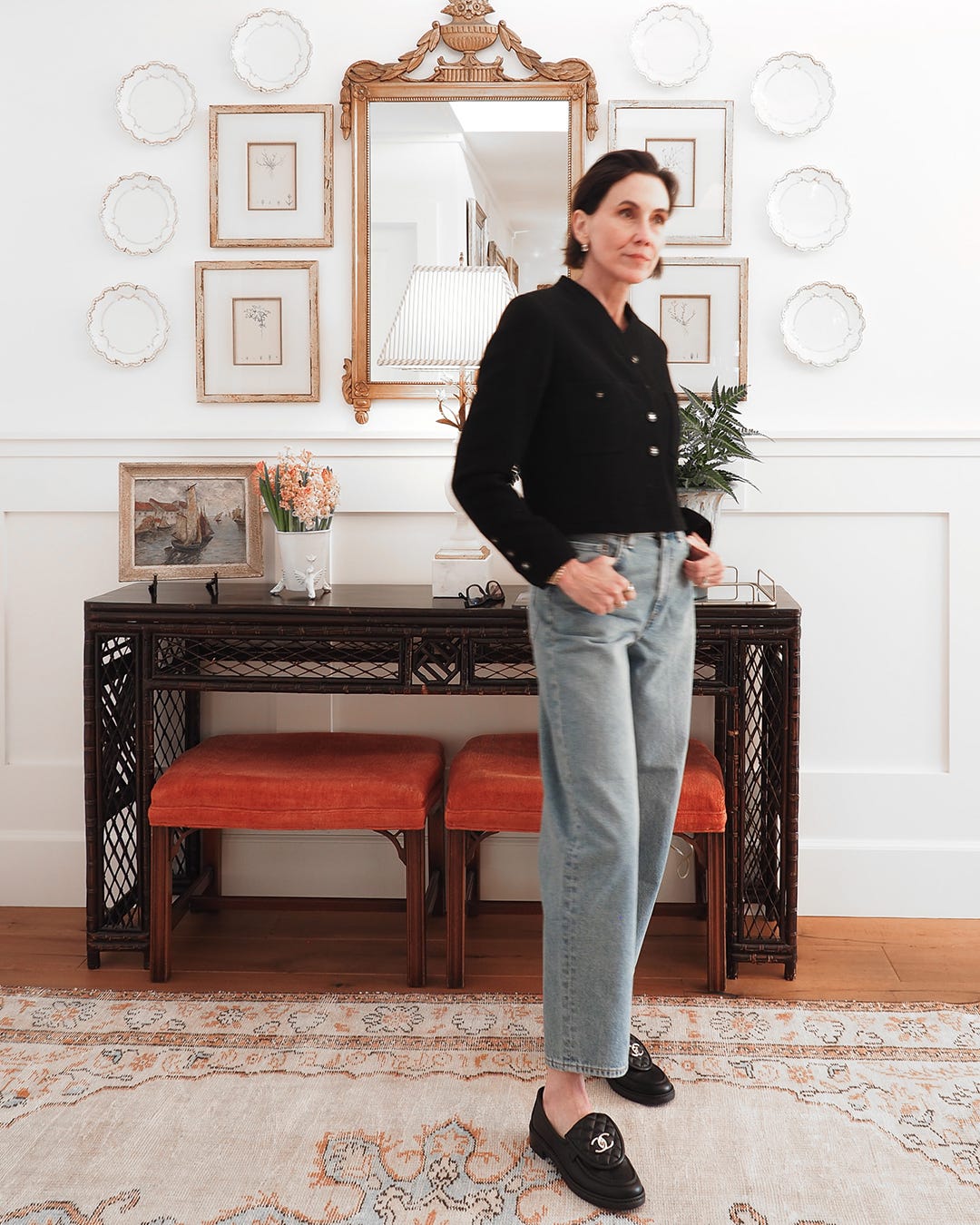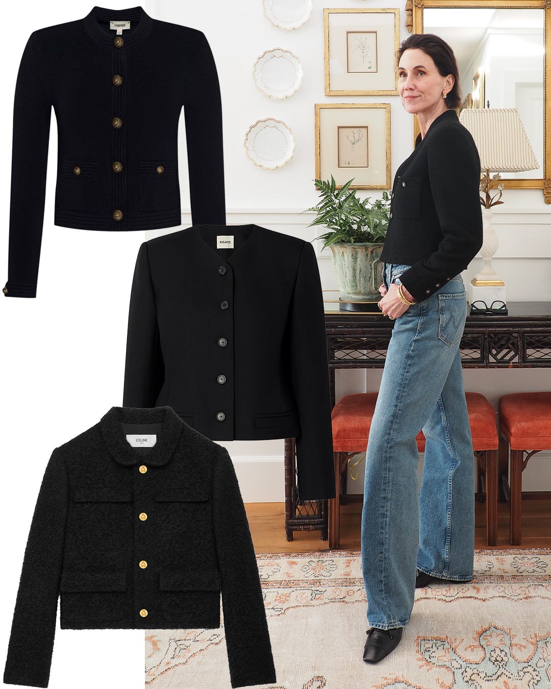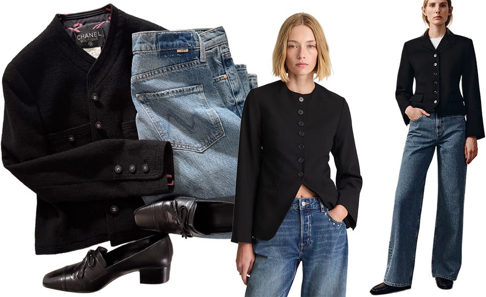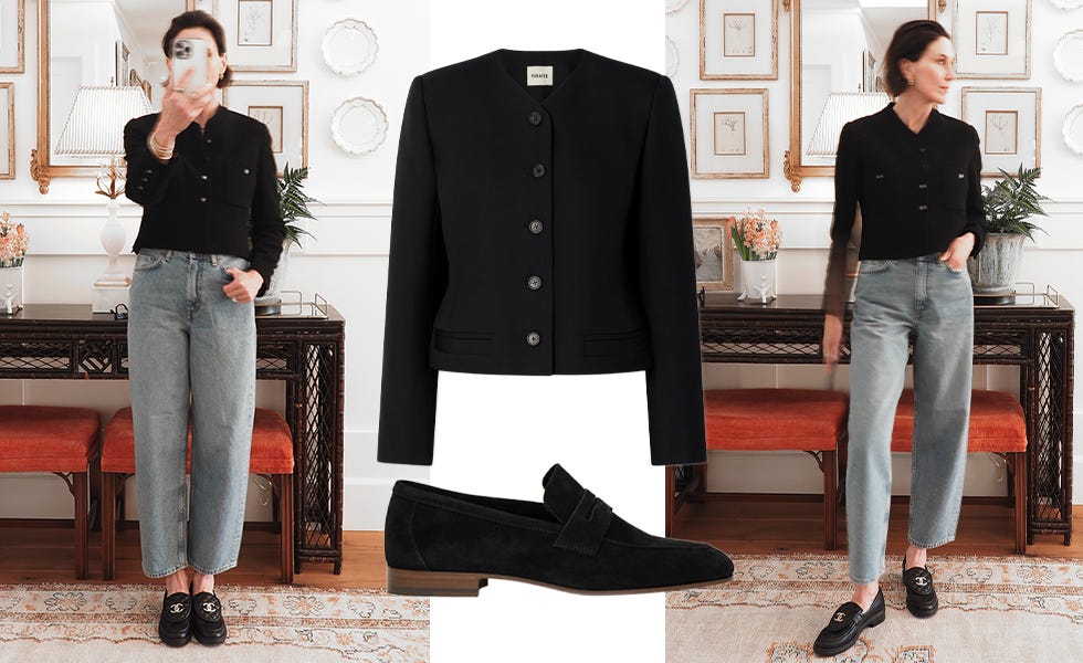 A vintage Chanel jacket can be substituted with a number of slightly shrunken cropped styles, whether jackets or knits. The silhouette is more important than the category. A Khaite jacket is almost identical to the Chanel piece in fit and neckline. I'd add this to my closet if I were shopping for a timeless, quality cropped black jacket, confident it would be a long-term keeper.