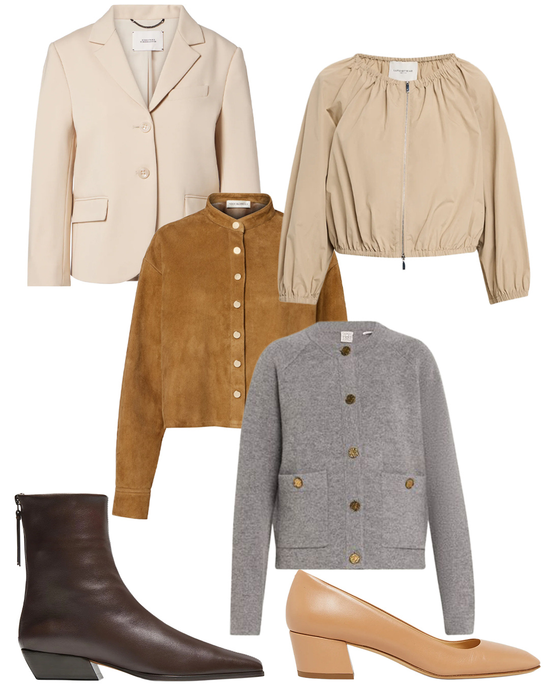 The same idea in a lighter palette of neutrals can be achieved with pieces like these. Even though one is more of a blouson, it would work because of where it hits on the waist. Both shoes are exceptional silhouettes for this look. I have the tan pumps on their way to me now. It's a style and color I could use in my closet.