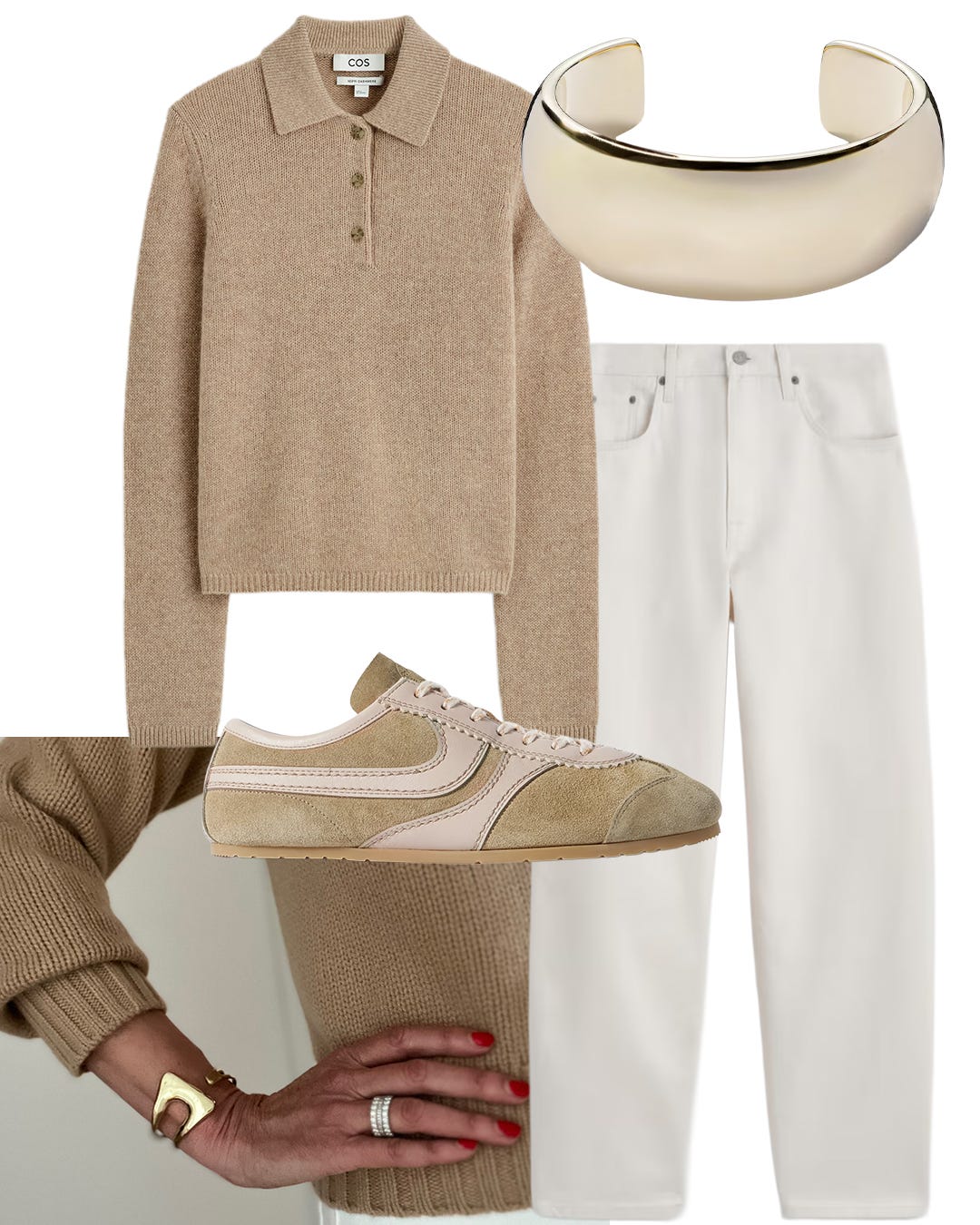 The same white denim, now styled with a lighter hand and a softer palette. A simple sweater and slim sneakers shift the whole mood without much effort, though suede loafers or woven Mary Janes work just as well here. The only thing I'd add is a single piece of jewelry with some weight to it, something that keeps the look from feeling too easy.