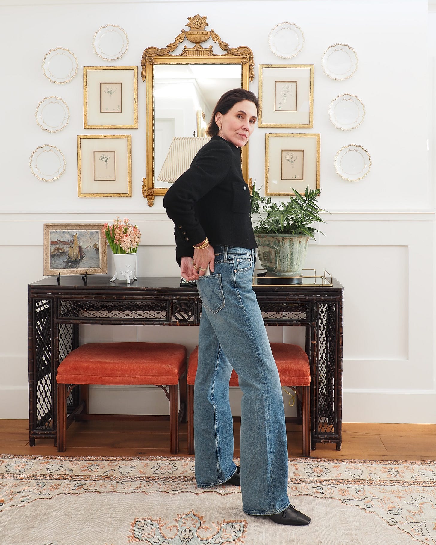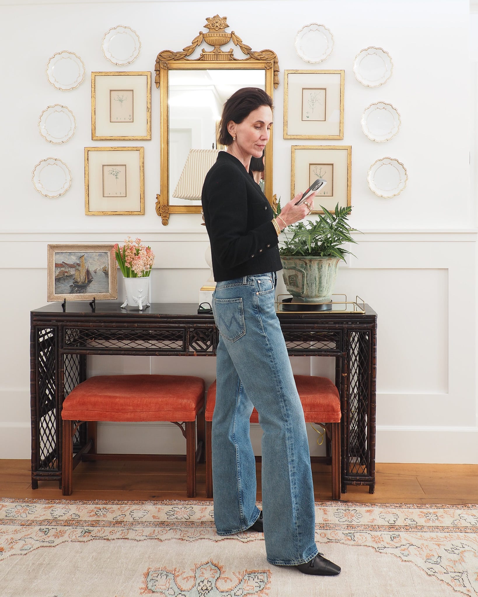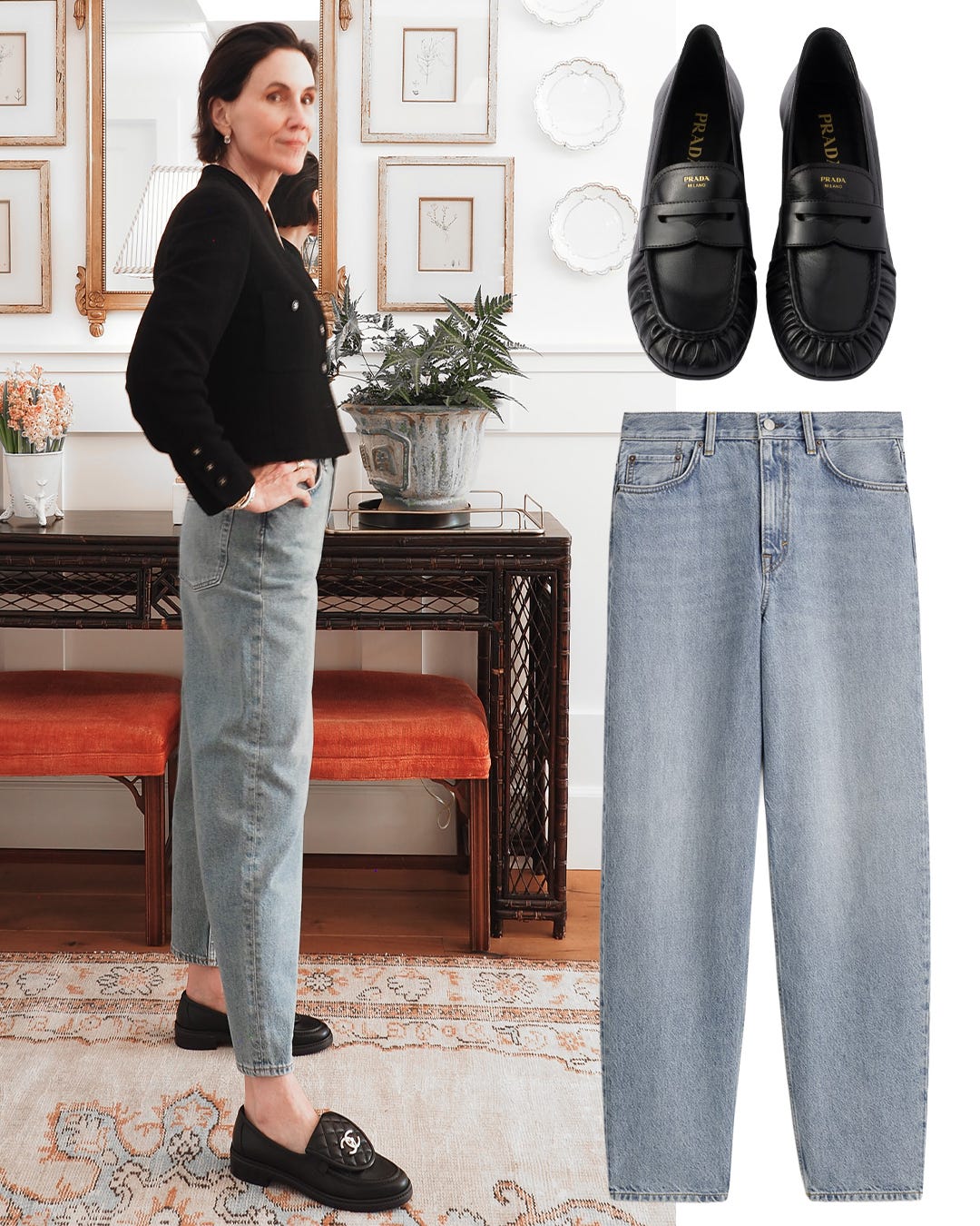 On to the second style of denim for this story. If you follow me on Instagram, you saw me styling MOTHER jeans with a faded wash and relaxed fit. I tried pairing the same cropped jacket and loafers to play with a different set of proportions, but floor-grazing hems aren't for me and the loafers didn't provide enough lift. I swapped them for a heeled style from The Row (sold out).