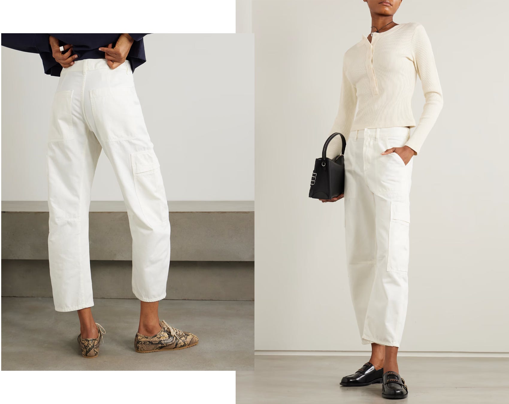 CARGO PANTS: A noted trend continuing into 2026, cargo pants are becoming the most interesting style to watch. The Citizens of Humanity pair above demonstrates their everyday appeal—simply styled with a cropped henley for effortless wearability. For more unexpected styling, I like the contrast of a shrunken tailored blazer with polished loafers, creating a serious-meets-casual tension. Current lightweight options worth considering include Leset’s Yoko Drawstring or Cargo, along with offerings from Tory Burch and the Citizens of Humanity pair pictured above.