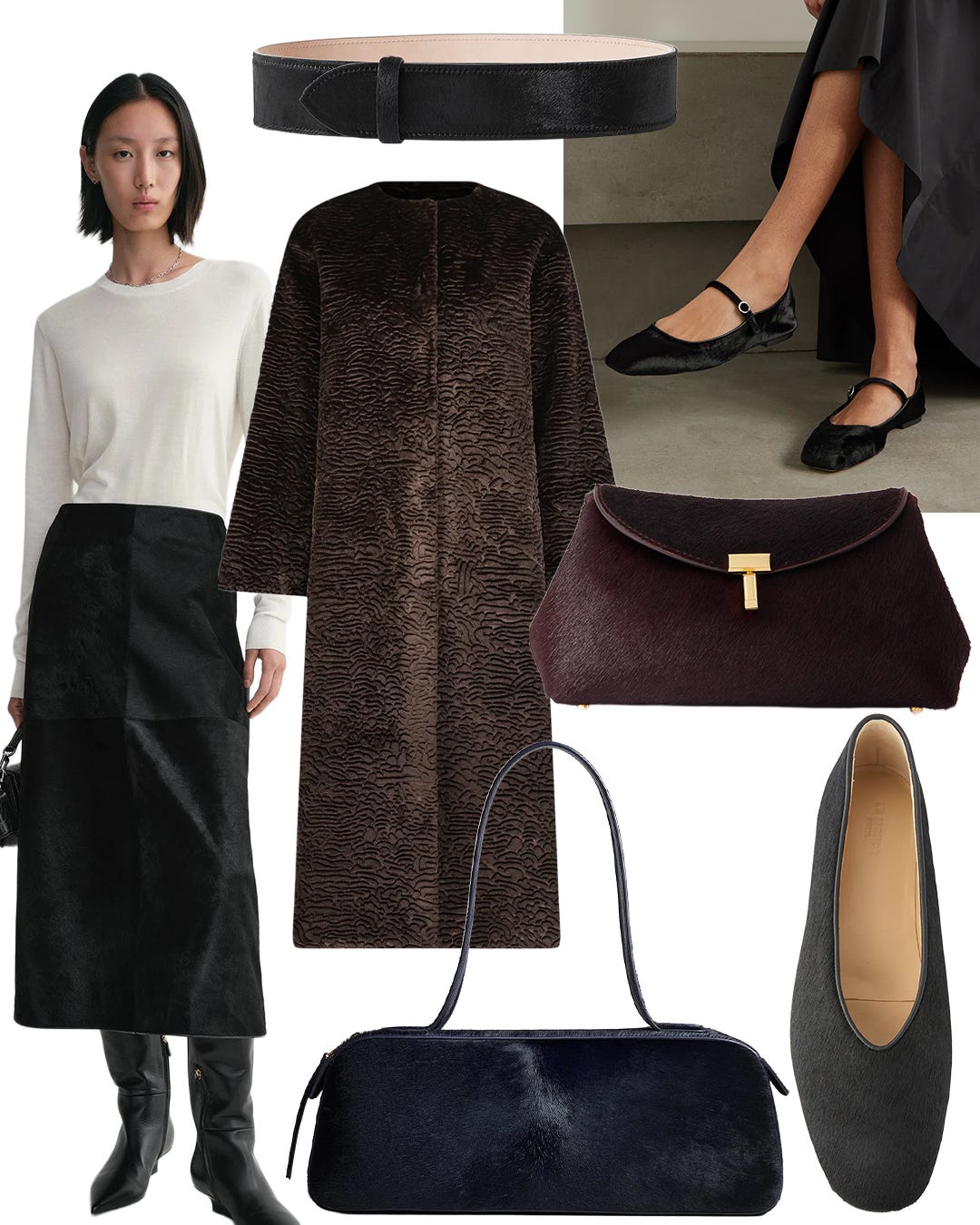 Toteme Paneled Calf Hair Midi Skirt; Khaite Calf Hair Belt; Aeyde Mary Jane; Le Monde Beryl Calf Hair Ballet Flat; Khaite Simona Navy Shoulder Bag; Toteme T-Lock Pony Hair Clutch burgundy or black; Gorski Faux Shearling Coat