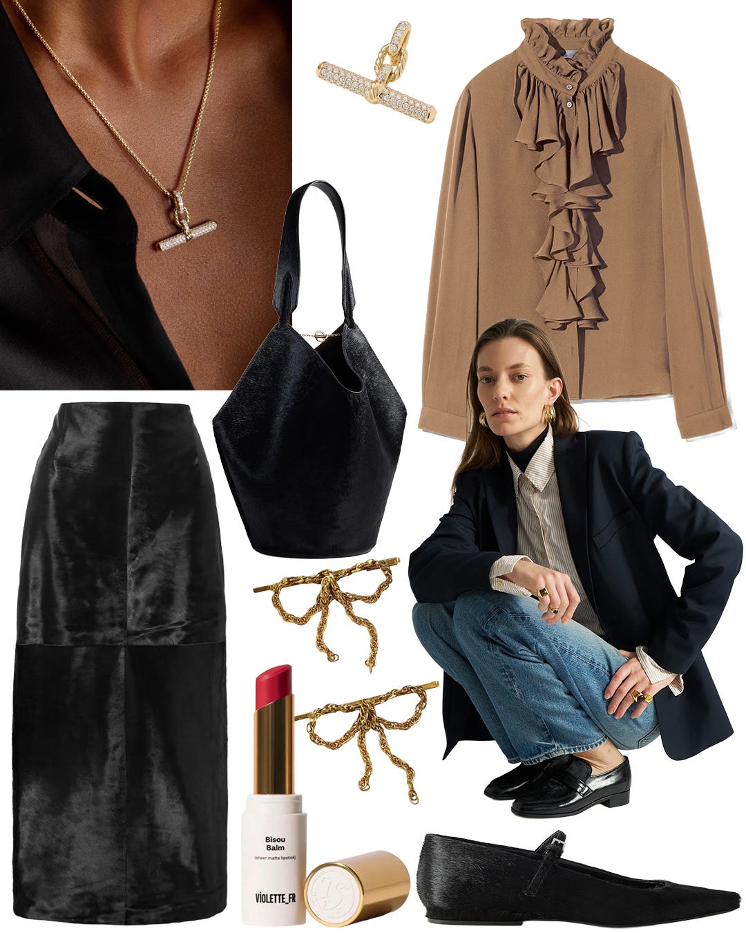 above: David Yurman Gold Pave Diamond Pendant; Khaite Lotus Calf Hair Shoulder Bag; Loulou de Saison Mary Jane flats; Nour Hammour pencil skirt; Violette_Fr Bisou Balm in Betise; Lelet NY 14K Gold Chain Bobby Pin; Nili Lotan Blouse; Jamier Haller Loafers