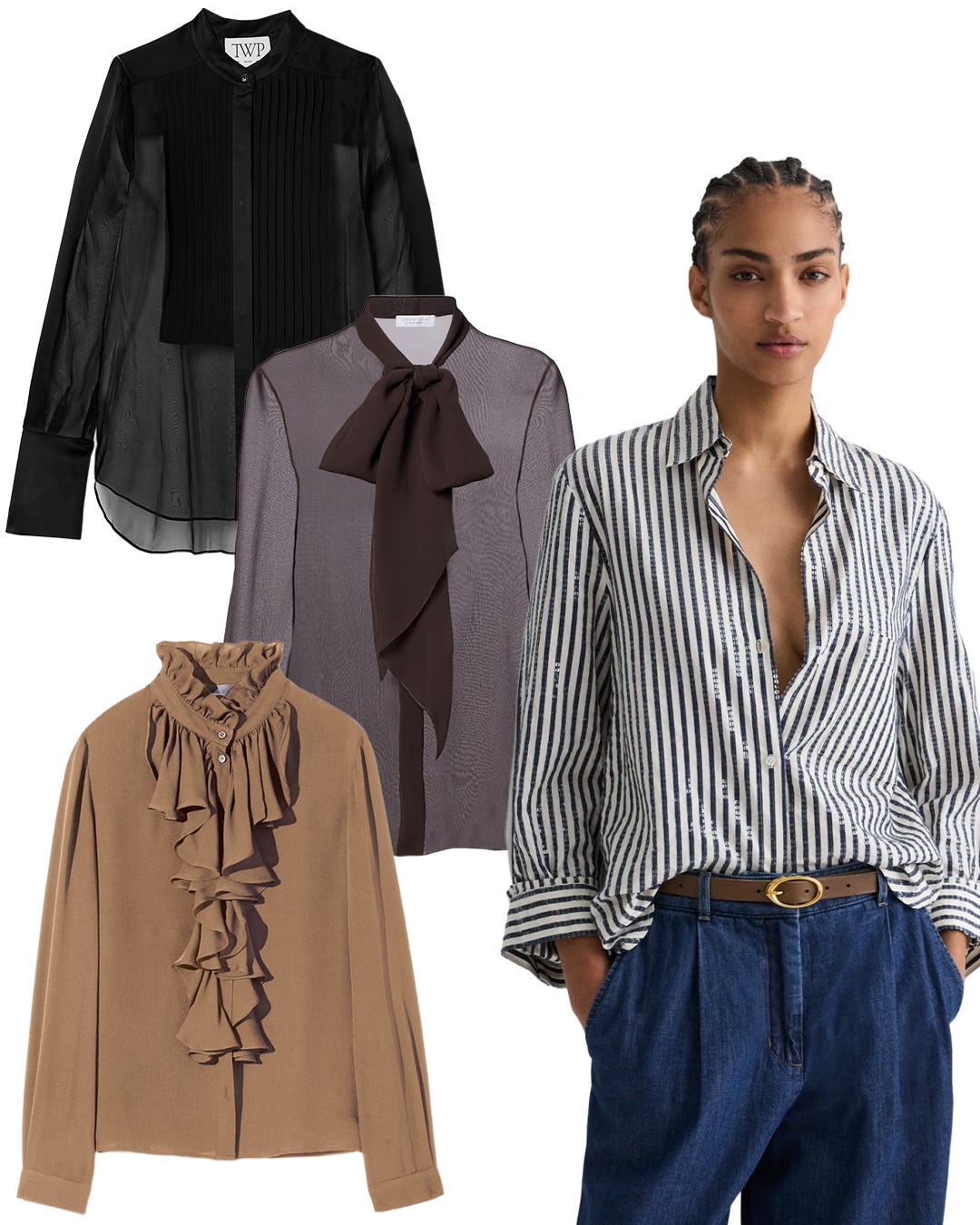 TWP Black Pintucked Silk Organza Blouse (also in brown) ; Gabriela Hearst Tie-Neck Silk Blouse; TWP Sequin on Stripe Shirt; Nili Lotan Cascading Ruffles