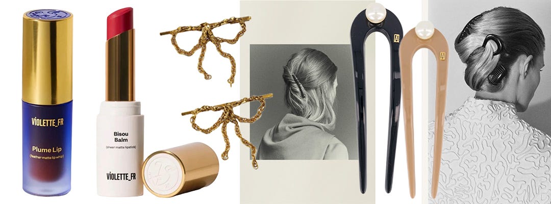 VIOLETTE_FR Plume Lip Stain in Rose Fume and Bisou Balm in Betise; Lelet NY 14K Gold Chain Hair Pins; Alexandre de Paris Acetate Pearl Hait Pin in natural or black; Images courtesy of The Row