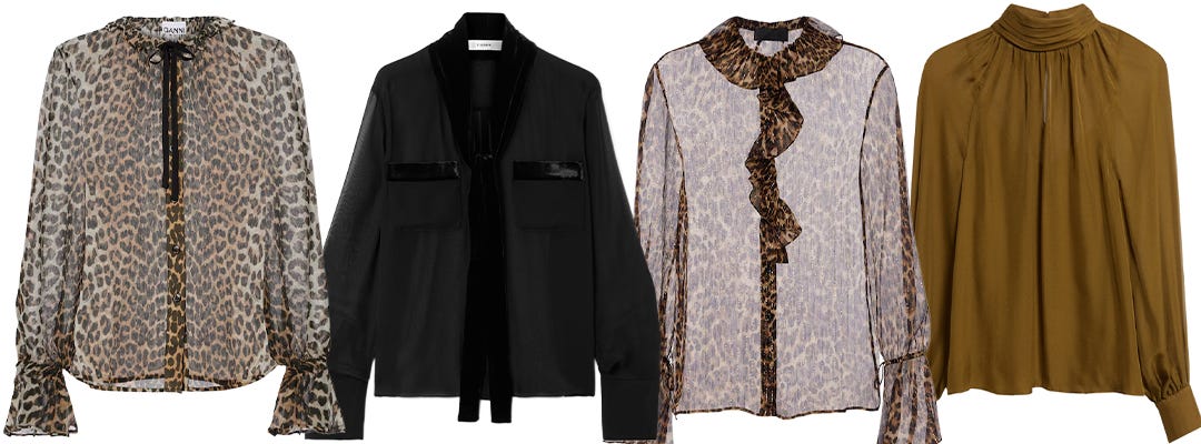 Ganni Leopard Print Tie-Neck Blouse; Frame Black Velvet Trimmed Silk Chiffon blouse; Nili Lotan Leopard Chiffon Blouse;Veronica Beard Moss High Neck Blouse