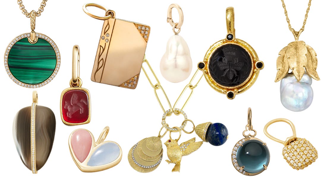 Clockwise from top left: David Yurman Malachite with Diamonds $3600; Carnelian Pegasus Charm $198; Devon Woodhill Book Charm $2750 (can be personalized); Single Diamond Baroque Pearl $300; Elizabeth Locke Queen Bee Onyx $7050; Vintage Cultured Baroque Pearl with Leaves $1395; Marla Aaron Itty Bitty Diamond Pendant $1925; Devon Woodhill Blue Topaz Moon $1250; Jenna Blake Acorn Charm $2800-$3800; Gemella Opal and Aquamarine Heart $1760; By Pariah Agate and Diamond Pebble $3000