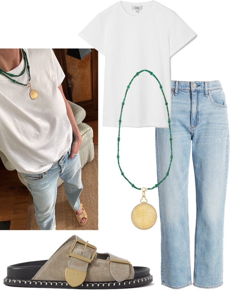 Here's my way of wearing color. A malachite beaded necklace from Devon Woodhill adds just enough for my day to day taste. I've doubled the strand and added their gold disc. Any charm would do. The green malachite feels like summer to me and looks great with my wardrobe of black, white and neutrals.