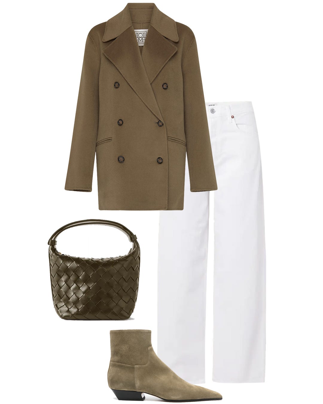 Swapping out dark jeans for a loose pair in white, in this case by AGOLDE (I like the loosely structured shape). My instinct pairing would be white with black, but I really like the muddy khaki tones here. The Toteme jacket is a winner with so many looks. The color is fabulous and a bit more wearable than classic tan or camel hues. I keep going back to …